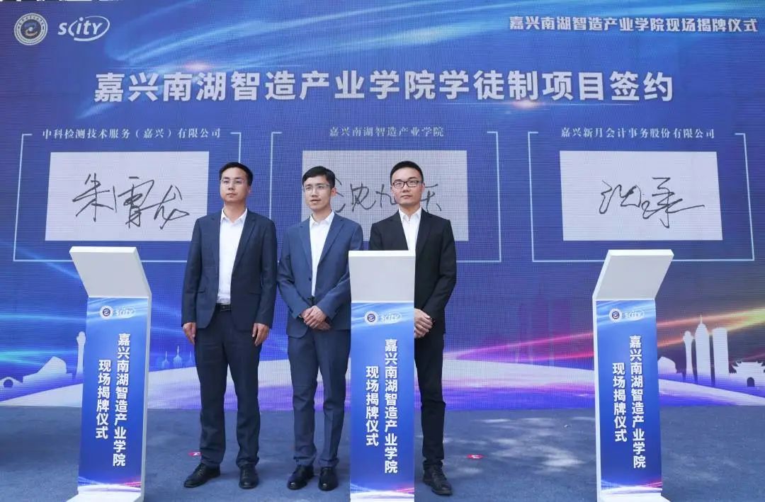 產(chǎn)業(yè)學院項目簽約儀式上,嘉興南湖智造產(chǎn)業(yè)學院先后與嘉興新月會計事務股份有限公司、中科檢測技術服務(嘉興)有限公司簽訂學徒制培養(yǎng)項目;與浙江邁興途智能裝備股份有限公司、湘家蕩區(qū)域管委會旅游和經(jīng)濟發(fā)展局簽訂技術服務項目;與天通精電新科技有限公司電子工程學院、浙江芯動科技有限公司簽訂崗位實習項目。