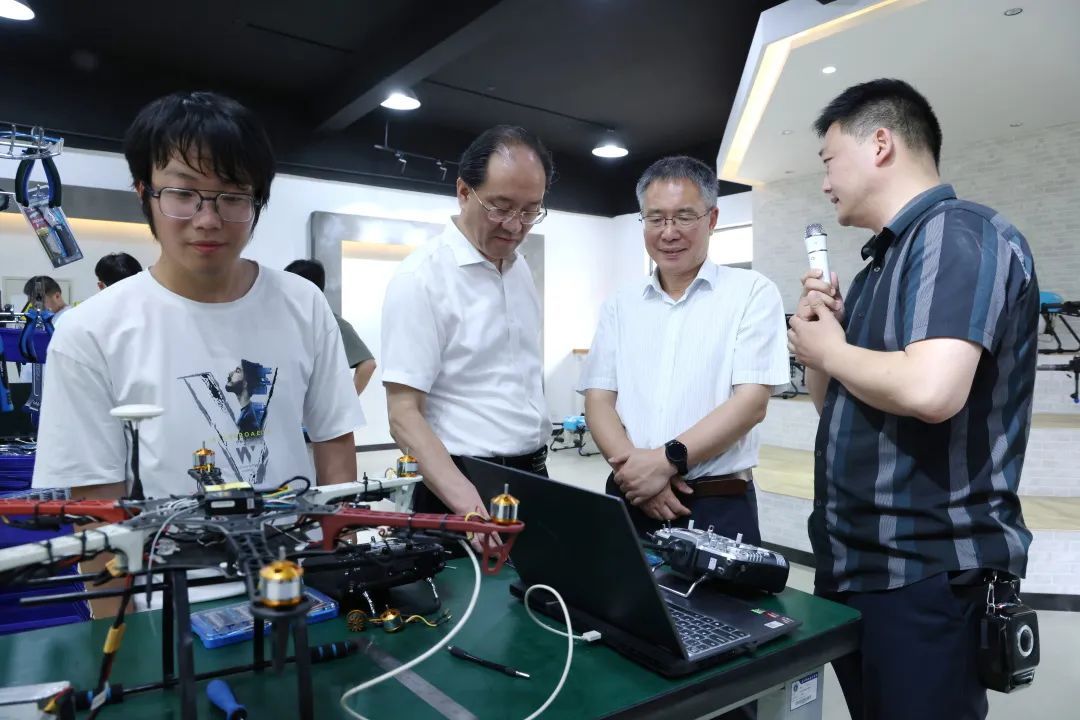 蔣國(guó)俊一行到學(xué)校無(wú)人機(jī)協(xié)同創(chuàng)新中心和工業(yè)互聯(lián)網(wǎng)智能產(chǎn)線綜合實(shí)訓(xùn)中心,實(shí)地了解無(wú)人機(jī)專業(yè)和工業(yè)互聯(lián)網(wǎng)專業(yè)的師資隊(duì)伍、人才培養(yǎng)、技術(shù)創(chuàng)新、社會(huì)服務(wù)等情況。與師生親切交談,仔細(xì)詢問(wèn)無(wú)人機(jī)的種類和用途,現(xiàn)場(chǎng)觀摩學(xué)生實(shí)操模擬,關(guān)心學(xué)生對(duì)所學(xué)技能的掌握程度,詳細(xì)了解學(xué)校的招生和留嘉率情況。