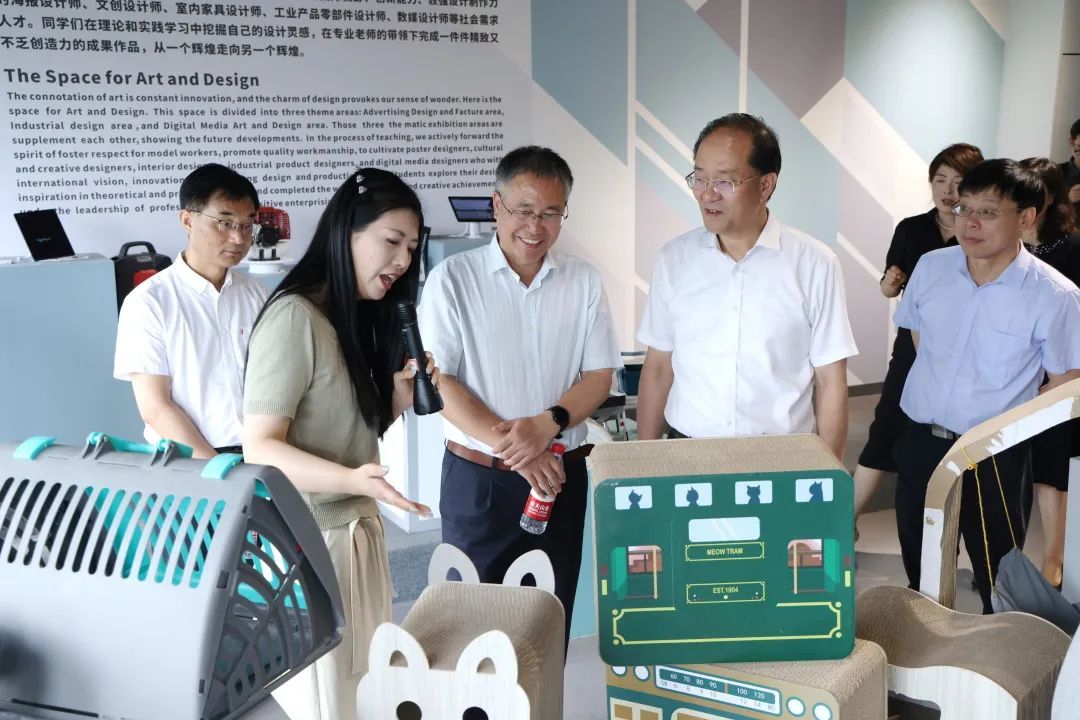 參觀時(shí)尚設(shè)計(jì)學(xué)院展廳,深入了解產(chǎn)教融合校企合作情況、學(xué)生就業(yè)方向及薪酬待遇、學(xué)校東西幫扶成果等,夸贊嘉職院專業(yè)設(shè)置與時(shí)俱進(jìn)、緊貼產(chǎn)業(yè)需求。欣賞師生親手設(shè)計(jì)的藝術(shù)作品,充分肯定了師生卓越的創(chuàng)新創(chuàng)造能力。