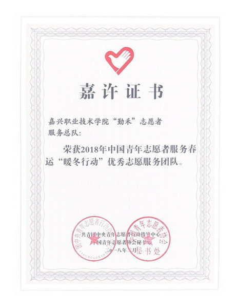 日前,團中央青年志愿者行動指導中心、中國青年志愿者協(xié)會公布了中國青年志愿者服務春運“暖冬行動”評選結(jié)果,對全國100個優(yōu)秀志愿服務團隊進行了表彰,我院團委“勤禾”志愿者服務總隊在2018年中國青年志愿者服務春運“暖冬行動”中,榮獲 “優(yōu)秀志愿服務團隊”稱號。