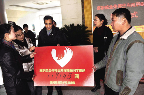 聞期振的事情被學(xué)校得知后,院領(lǐng)導(dǎo)高度關(guān)注,短短幾天時(shí)間內(nèi),全校師生紛紛捐款相助,籌集到的善款超過(guò)11萬(wàn)元。此事經(jīng)網(wǎng)絡(luò)、電臺(tái)、報(bào)紙報(bào)道后,湖州、嘉興等地的市民爭(zhēng)相獻(xiàn)出愛(ài)心。