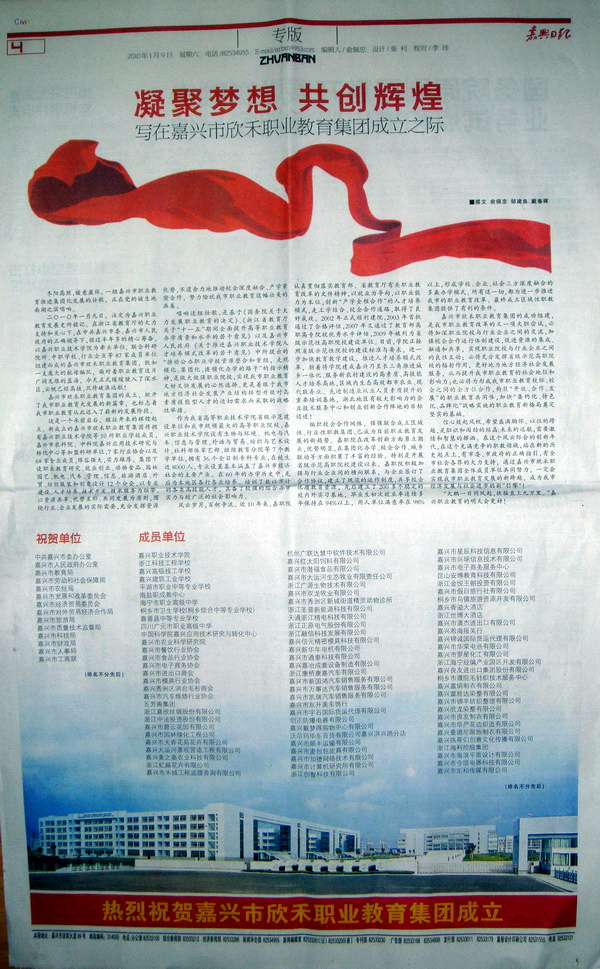 二〇一〇年一月九日,注定為嘉興職業(yè)教育發(fā)展史所銘記。在浙江省教育廳的大力支持和關(guān)心下,在中共嘉興市委、嘉興市人民政府的正確領(lǐng)導(dǎo)下,經(jīng)過半年多的精心籌備,以嘉興職業(yè)技術(shù)學(xué)院為牽頭單位,聯(lián)合科研院所、中職學(xué)校、行業(yè)企業(yè)等87家成員單位組建而成的嘉興市欣禾職業(yè)教育集團(tuán),猶如一支龐大的航母編隊(duì),面對著職業(yè)教育這片廣闊無垠的藍(lán)海,今天正式緩緩駛?cè)肓松钏畢^(qū),云帆已經(jīng)高掛,只待破浪遠(yuǎn)航!