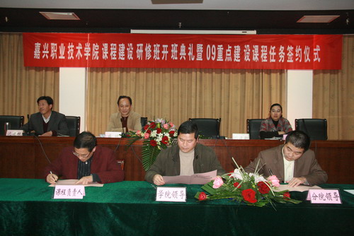 為了加快學(xué)院省級(jí)示范性高等職業(yè)院校的課程體系與教學(xué)內(nèi)容建設(shè),保證重點(diǎn)建設(shè)課程的建設(shè)質(zhì)量,強(qiáng)化工學(xué)結(jié)合課程的建設(shè)要求,學(xué)院特舉辦課程建設(shè)研修班,于2009年11月25日下午隆重舉行課程建設(shè)研修班開班典禮及2009重點(diǎn)建設(shè)課程任務(wù)簽約儀式。會(huì)議由教務(wù)處沈建根處長主持,沈處長介紹了《嘉興職業(yè)技術(shù)學(xué)院課程建設(shè)研修班活動(dòng)方案》,提出了集中與分組結(jié)合、校內(nèi)與校外結(jié)合、研修與實(shí)施結(jié)合的“三結(jié)合”活動(dòng)方式和圍繞課程開發(fā)、設(shè)計(jì)及所承擔(dān)建設(shè)課程的工作任務(wù)開展的研修內(nèi)容。