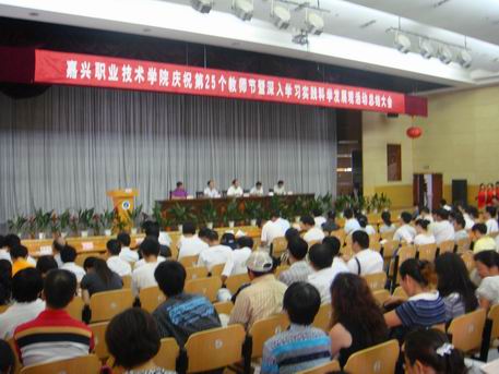 慶祝大會由學(xué)院黨委委員、副院長都建明主持。院長盛健宣讀了“嘉政干〔2009〕11號”文件,錢諶同志任嘉興職業(yè)技術(shù)學(xué)院副院長。學(xué)院黨委副書記、副院長周建新宣讀嘉興市教育基金會、學(xué)院教育基金表彰文件;學(xué)院領(lǐng)導(dǎo)為各級優(yōu)秀教師、優(yōu)秀教育工作者頒發(fā)榮譽證書;教師代表施群英、學(xué)生代表虞學(xué)博先后發(fā)言,為教職工獻上熱情的節(jié)日祝福。