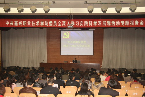 3月18日下午,學(xué)院舉辦深入學(xué)習(xí)實(shí)踐科學(xué)發(fā)展觀專(zhuān)題報(bào)告會(huì),邀請(qǐng)中共嘉興市委黨校徐連林副教授來(lái)院作題為《關(guān)于科學(xué)發(fā)展觀的若干理論與實(shí)踐問(wèn)題》的輔導(dǎo)報(bào)告。學(xué)院黨政領(lǐng)導(dǎo)、中層及助理以上干部和全體黨員參加會(huì)議。報(bào)告會(huì)由宣傳部副部長(zhǎng)鄒建良主持。