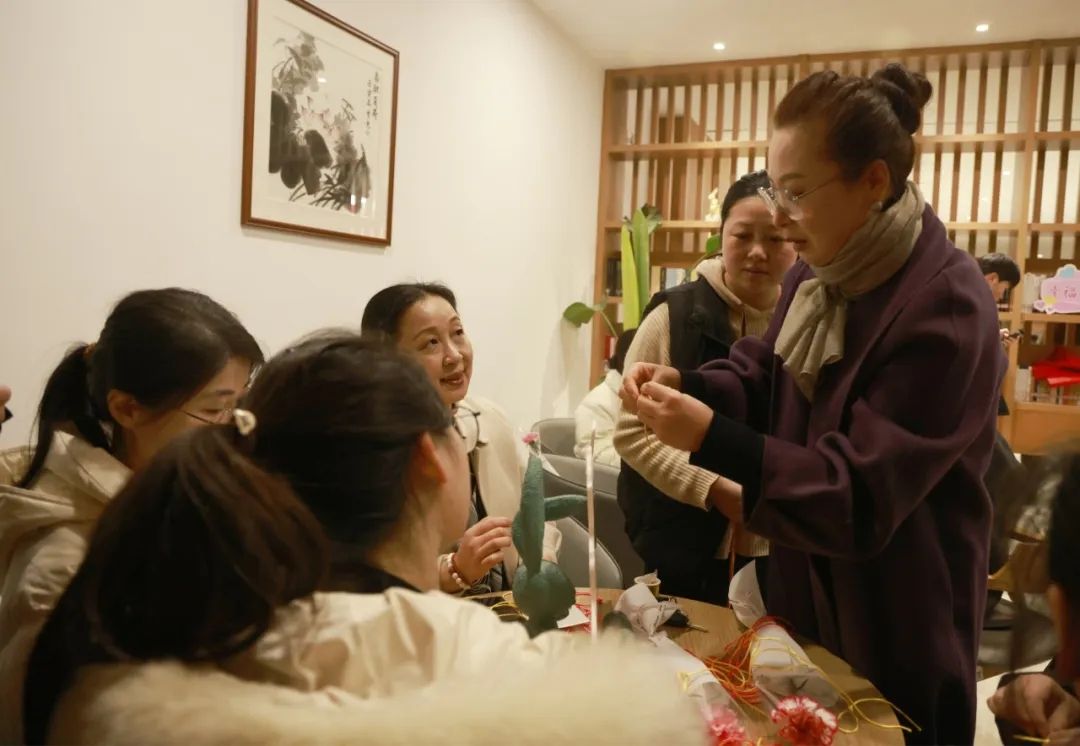 學(xué)校三八節(jié)活動不僅受到了女教職工們的追捧,還吸引了嘉興市公安局出入境管理局婦女小組的參與。在手工編織活動區(qū)域,她們一邊聆聽指導(dǎo)老師的講解,一邊聚精會神緊跟老師節(jié)奏,一步一步動手學(xué)習(xí),現(xiàn)場氛圍十分融洽。