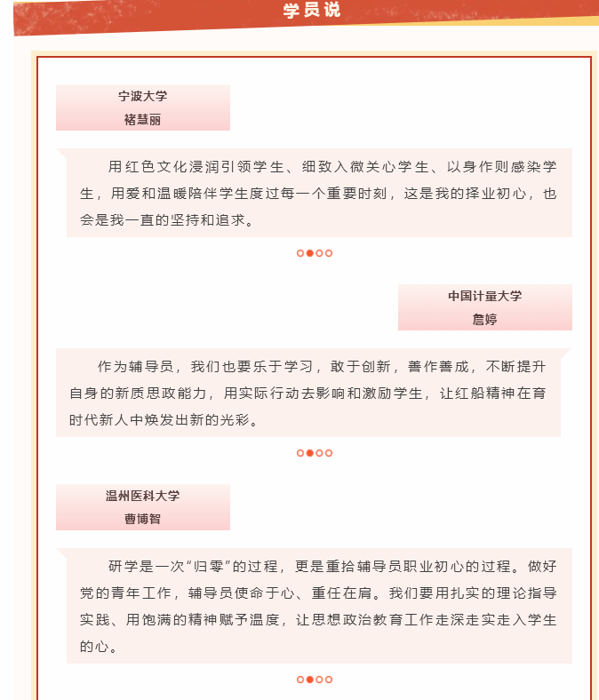下一步,學校將加強統(tǒng)籌協(xié)調(diào),高標準謀劃和推進基地建設(shè)管理,持續(xù)加強研學課程、師資、研修線路等資源建設(shè),積極探索創(chuàng)新研修模式,突出理論學習和實地調(diào)研的有機結(jié)合;強化“分類分層、優(yōu)選優(yōu)培”,打造特色理論課程包與研學線路包,提供匹配精準、主題突出的個性化“菜單式”培訓方案,確保高質(zhì)量完成培訓研修任務(wù),為浙江省高校思想政治隊伍建設(shè)貢獻力量。