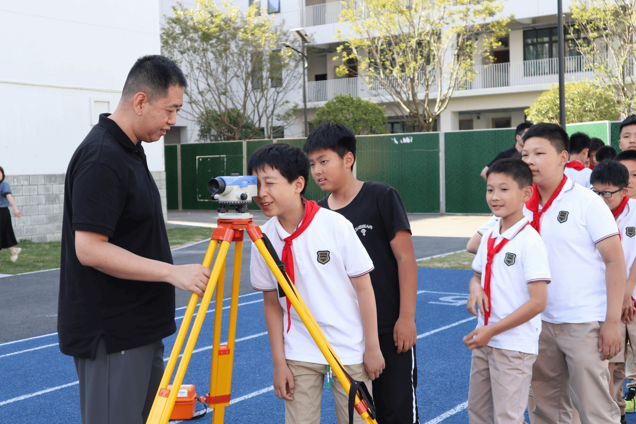 為了讓學(xué)生們熟悉對測量儀器的使用,嘉職教師提前準(zhǔn)備好自動安平水準(zhǔn)儀,李冬霞等團(tuán)隊教師和學(xué)生志愿者們手把手指導(dǎo)同學(xué)們?nèi)绾渭茉O(shè)儀器、如何瞄準(zhǔn)目標(biāo)、如何進(jìn)行讀數(shù)、如何比較高低,培養(yǎng)了孩子們的動手實踐能力。