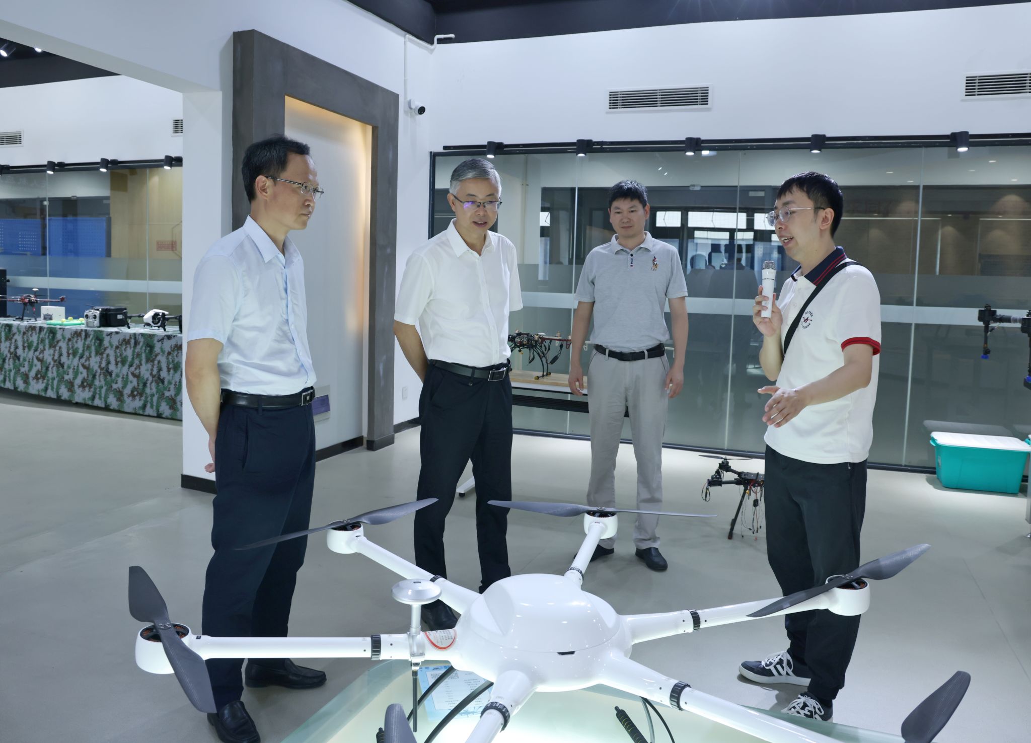 徐勇一行參觀了學(xué)校無人機(jī)協(xié)同創(chuàng)新中心、工業(yè)互聯(lián)網(wǎng)智能產(chǎn)線、時尚設(shè)計(jì)學(xué)院展廳。