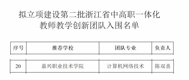 近日,浙江省教育廳公布第二批中高職一體化教師教學(xué)創(chuàng)新團(tuán)隊(duì)名單,嘉職院計(jì)算機(jī)網(wǎng)絡(luò)技術(shù)專業(yè)團(tuán)隊(duì)成功入圍。