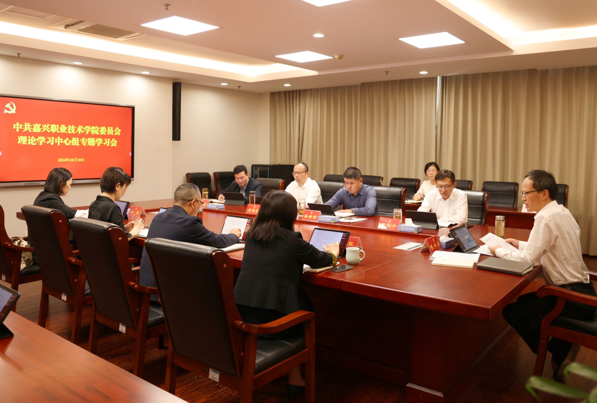 10月10日,嘉職院黨委理論學(xué)習(xí)中心組召開專題學(xué)習(xí)會,學(xué)習(xí)全國教育大會精神和習(xí)近平同志《論教育》。黨委書記朱學(xué)軍主持并作交流發(fā)言,黨委委員、副校長樓平作交流發(fā)言。