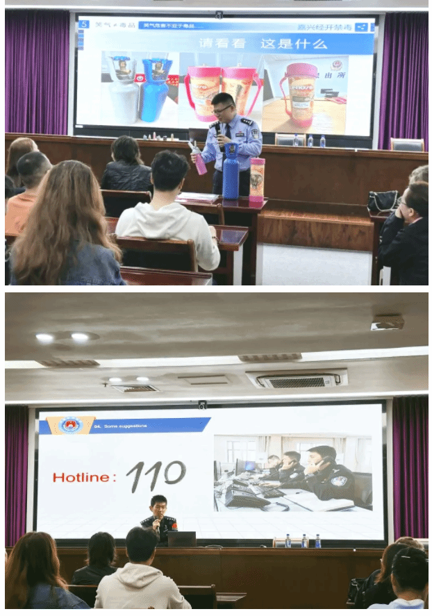 嘉興市經(jīng)開區(qū)禁毒部門聯(lián)合嘉興出入境邊防檢查站走進嘉職院,為留學(xué)生新生開展毒品預(yù)防和反詐教育宣傳講座。講座上,嘉興出入境邊防檢查站警官列舉了近年來在留學(xué)生人群中高發(fā)的電信詐騙案例,提醒來華留學(xué)生們要提高警惕,謹(jǐn)防詐騙。“嘉警”平安星宣講師孟建林介紹了毒品的種類、危害和防毒注意事項,叮囑留學(xué)生遵守中國法律法規(guī),提高毒品辨別和防范能力。