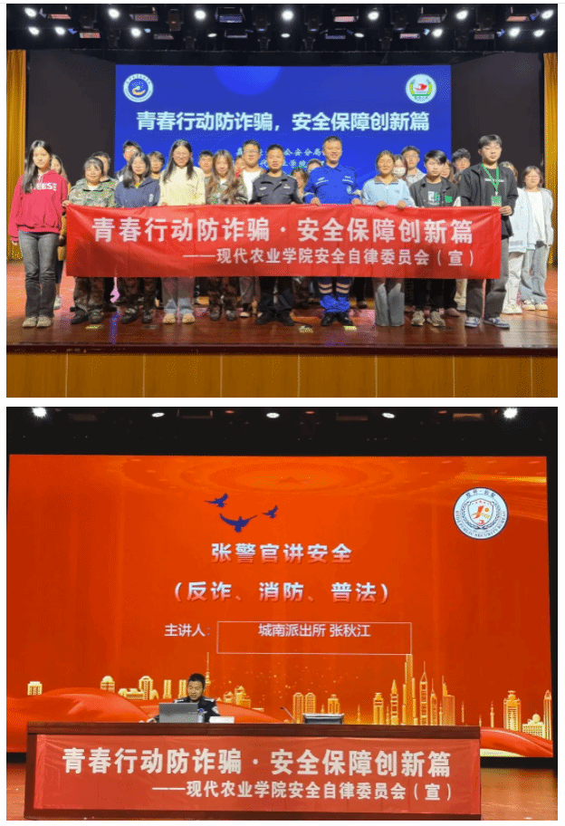 現(xiàn)代農(nóng)業(yè)學(xué)院安全自律委員會特邀城南派出所民警為學(xué)生帶來專題教育講座。民警圍繞電信詐騙的概念、常見形式、防范對策以及補救措施四個方面,通過列舉身邊的真實案例、情景模擬、互動問答等方式,生動形象地展示了電信詐騙的危害性和反詐騙工作的重要性,極大地激發(fā)了學(xué)生們的參與熱情和思考深度。