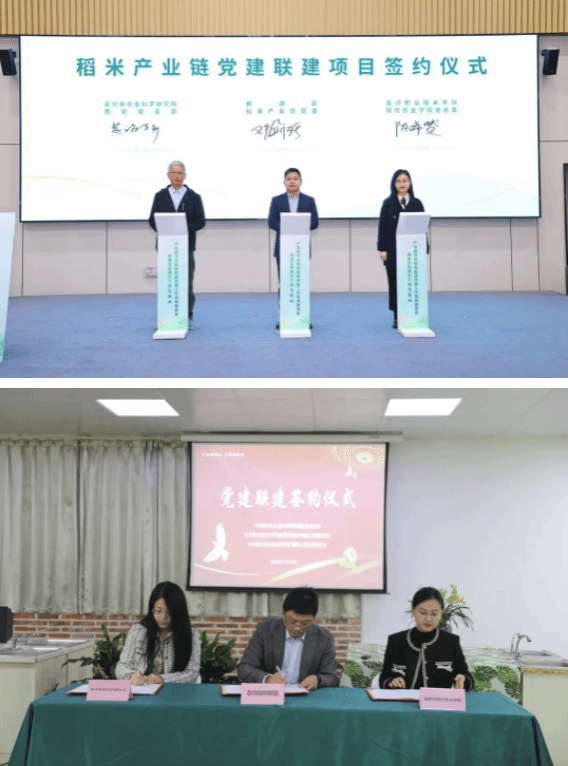 會(huì)議上,區(qū)稻米產(chǎn)業(yè)鏈黨委、嘉興市農(nóng)業(yè)科學(xué)研究院南繁黨支部與嘉興職業(yè)技術(shù)學(xué)院現(xiàn)代農(nóng)業(yè)學(xué)院黨總支,圍繞稻米產(chǎn)業(yè)“產(chǎn)學(xué)研”一體化簽訂黨建聯(lián)建協(xié)議,共育優(yōu)質(zhì)品種、共推良種繁育、共享研究成果等,推動(dòng)稻米產(chǎn)業(yè)鏈全面優(yōu)化升級(jí)。