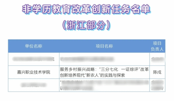 近日,教育部公示2024年學習型社會建設重點任務(高等繼續(xù)教育領域)培育建設名單。經(jīng)評議,建設名單中非學歷教育改革創(chuàng)新建設任務共103項,浙江省入選3項,嘉職院申報的服務鄉(xiāng)村振興戰(zhàn)略“三分七化 一證綜評”改革創(chuàng)新培養(yǎng)現(xiàn)代“新農(nóng)人”的實踐與探索項目成功入圍。