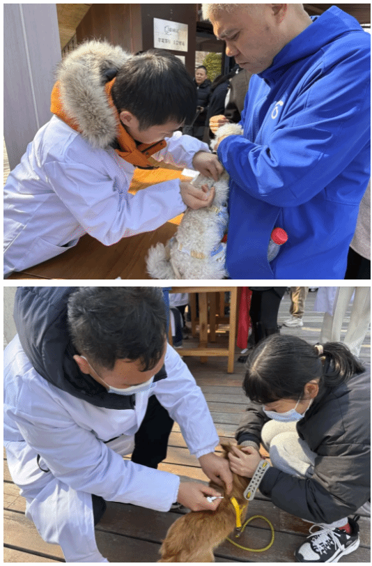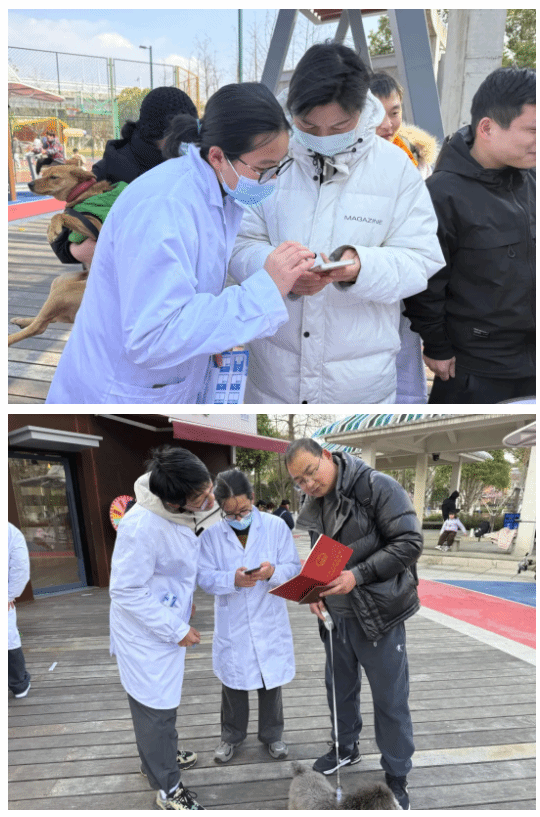 身穿白大褂的“小青芒”志愿者也成為一道亮眼的風(fēng)景線。他們分工協(xié)作,有的引導(dǎo)居民填寫犬證辦理材料,有的發(fā)放《文明養(yǎng)犬手冊》,有的為寵物主人講解科學(xué)喂養(yǎng)知識?!昂芏嗑用駥︷B(yǎng)犬法規(guī)了解不全面,我們通過案例講解,幫助他們理解遛狗牽繩、定期免疫的重要性。”“小青芒”志愿者劉盈盈說。居民陳阿姨帶著愛犬完成了疫苗注射和辦證流程,她感慨道:“平時工作忙,一直沒時間帶狗狗打疫苗,這次活動既省心又放心,非常感謝老師和學(xué)生們的服務(wù)!”