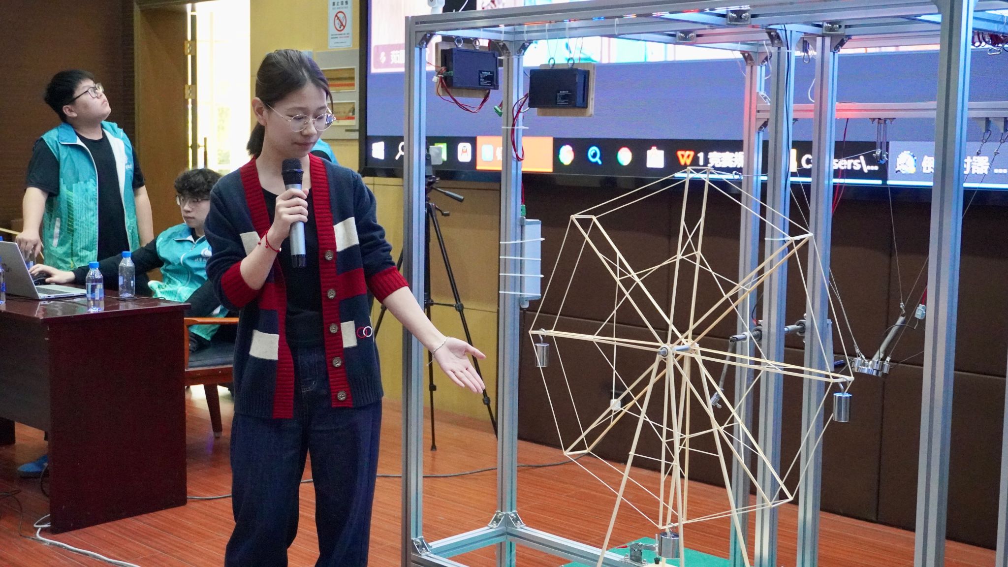 “此次比賽是一次將課堂上的結(jié)構(gòu)力學(xué)公式變成可觸可感的實(shí)戰(zhàn)機(jī)會(huì)。我們團(tuán)隊(duì)連續(xù)1個(gè)月駐扎實(shí)驗(yàn)室,在指導(dǎo)老師帶領(lǐng)下優(yōu)化了12個(gè)版本的摩天輪桁架節(jié)點(diǎn)設(shè)計(jì)。通過參與競(jìng)賽,我們對(duì)理論知識(shí)有了更加深入、全面且系統(tǒng)的理解和掌握,同時(shí)在動(dòng)手實(shí)踐中也顯著提升了結(jié)構(gòu)制作、材料加工與動(dòng)態(tài)調(diào)試等工程實(shí)操能力?!备?jìng)賽一等獎(jiǎng)獲得者,城市建設(shè)學(xué)院學(xué)生黃觀峰說。據(jù)悉,該團(tuán)隊(duì)設(shè)計(jì)的竹制摩天輪結(jié)構(gòu)模型以全場(chǎng)最輕的124.5克自重,成功承載7個(gè)總重達(dá)9千克的砝碼,創(chuàng)造出高達(dá)72倍(9kg/0.1245kg)的最優(yōu)荷重比。其創(chuàng)新設(shè)計(jì)的轉(zhuǎn)輪結(jié)構(gòu)在二級(jí)加載測(cè)試中表現(xiàn)優(yōu)異,在20秒內(nèi)完成了6圈標(biāo)準(zhǔn)轉(zhuǎn)速的平穩(wěn)運(yùn)轉(zhuǎn),充分展現(xiàn)了團(tuán)隊(duì)在輕量化結(jié)構(gòu)設(shè)計(jì)與動(dòng)態(tài)荷載優(yōu)化方面的卓越能力。