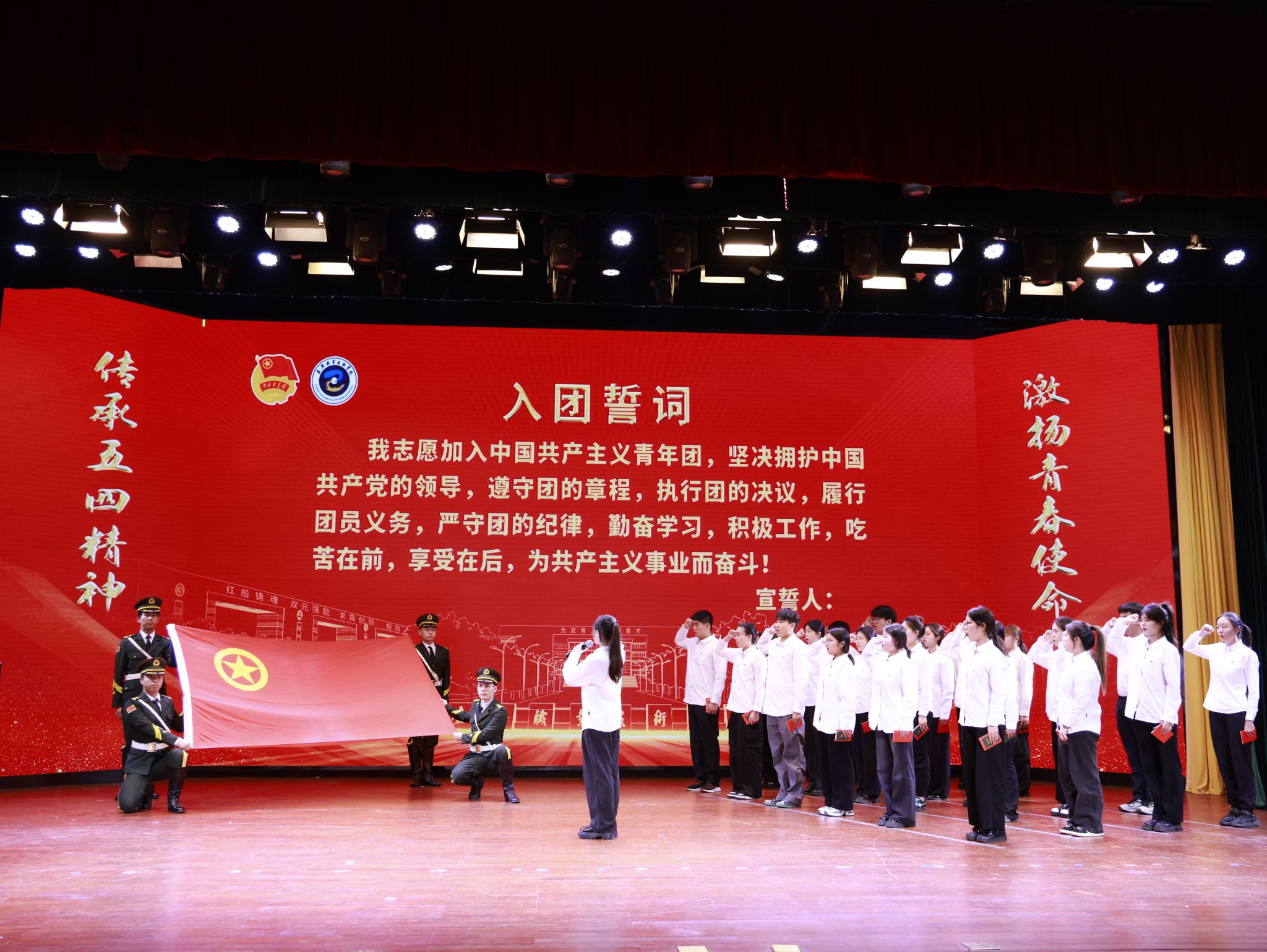 入團儀式上,24名新發(fā)展團員代表上臺,各學院團總支書記為他們頒發(fā)團徽、團員證和團章。隨后,全體新發(fā)展團員們在團旗下莊嚴宣誓。