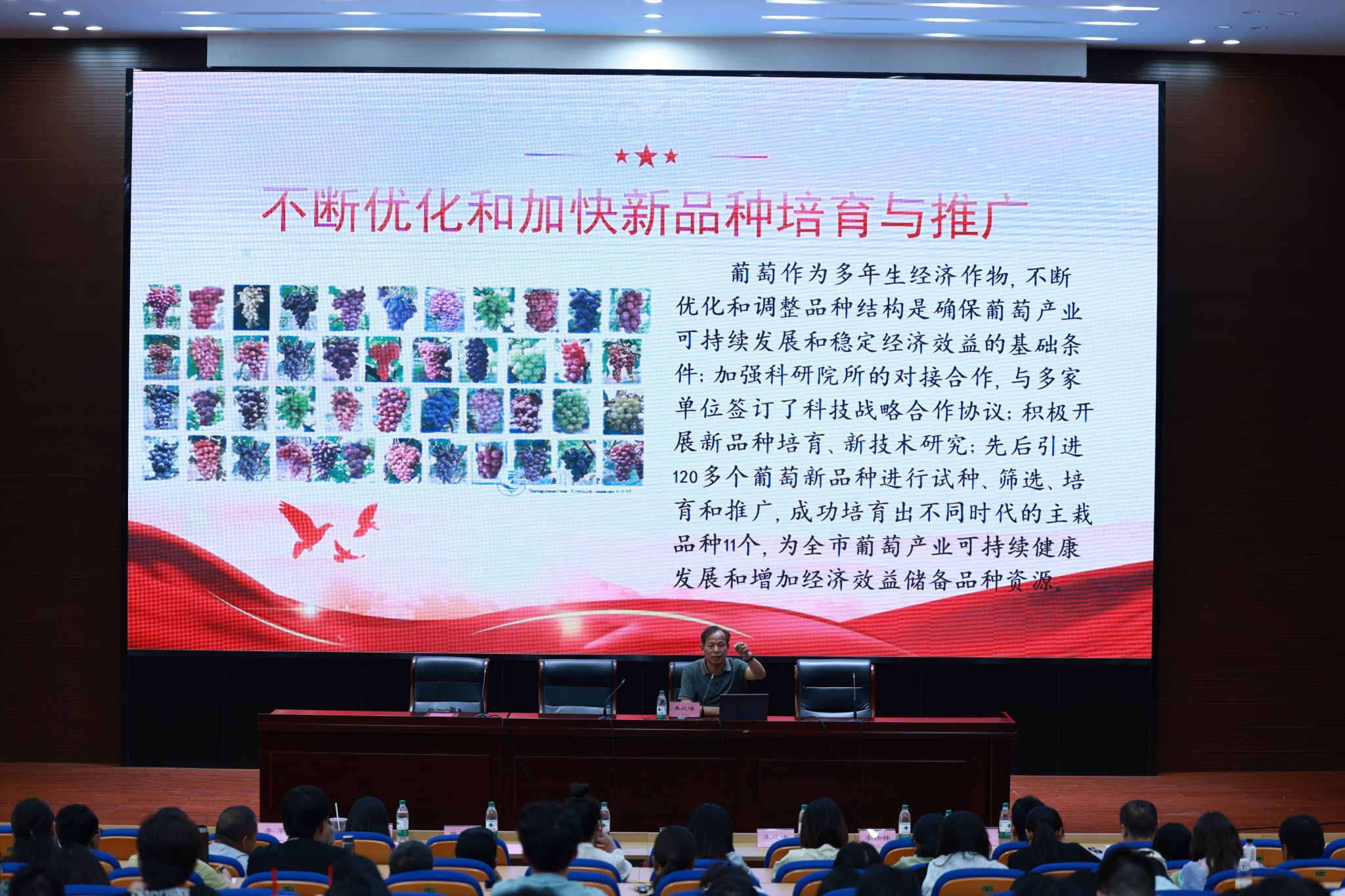 活動(dòng)當(dāng)天,朱屹峰以“科技創(chuàng)新助推葡萄產(chǎn)業(yè)高質(zhì)量發(fā)展”為題,結(jié)合自身30余年來(lái)從事葡萄種植和技術(shù)推廣的經(jīng)歷,用質(zhì)樸的語(yǔ)言、生動(dòng)的事例,講述了自己扎根農(nóng)業(yè)一線,潛心鉆研葡萄種植技術(shù),不斷探索創(chuàng)新,帶領(lǐng)農(nóng)民致富的故事,激勵(lì)師生“在創(chuàng)新中突破,在實(shí)干中圓夢(mèng)”。