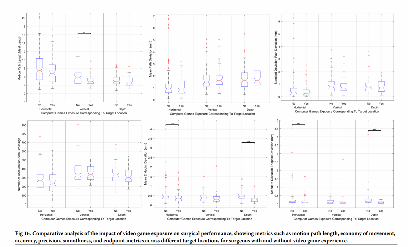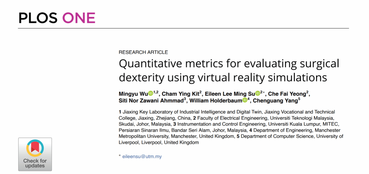 在健康醫(yī)療方向,研究基于虛擬現(xiàn)實(VR)手術(shù)模擬平臺,建立了一套外科手術(shù)技能量化評估體系。該體系設(shè)計了包括軌跡平滑性、操作反應(yīng)時延、末端精度控制和操作冗余度在內(nèi)的多維度指標,可全面刻畫手術(shù)者的靈巧度水平。實驗對比發(fā)現(xiàn),使用優(yōu)勢手、坐姿及10倍放大倍率能夠顯著提升操作精度和穩(wěn)定性,而生活習(xí)慣變量(如咖啡攝入、睡眠時長)影響有限。研究同時揭示了不同專業(yè)背景與經(jīng)驗水平的被試在技能收斂速度和操作穩(wěn)定性上的顯著差異。該成果為醫(yī)學(xué)教育提供了一套可重復(fù)、可量化、跨個體對比的評價體系,為個性化外科訓(xùn)練和外科教育智能化轉(zhuǎn)型奠定了重要基礎(chǔ)。