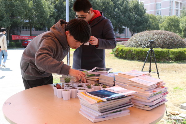 “書香換花香,綠意換情意”活動由“看圖識花”、“環(huán)保標語征集”和“圖書換綠植”三部分組成,吸引了不少過往師生駐足,園林專業(yè)的同學在一旁向大家介紹植物的生長習性、養(yǎng)護知識等科普知識。