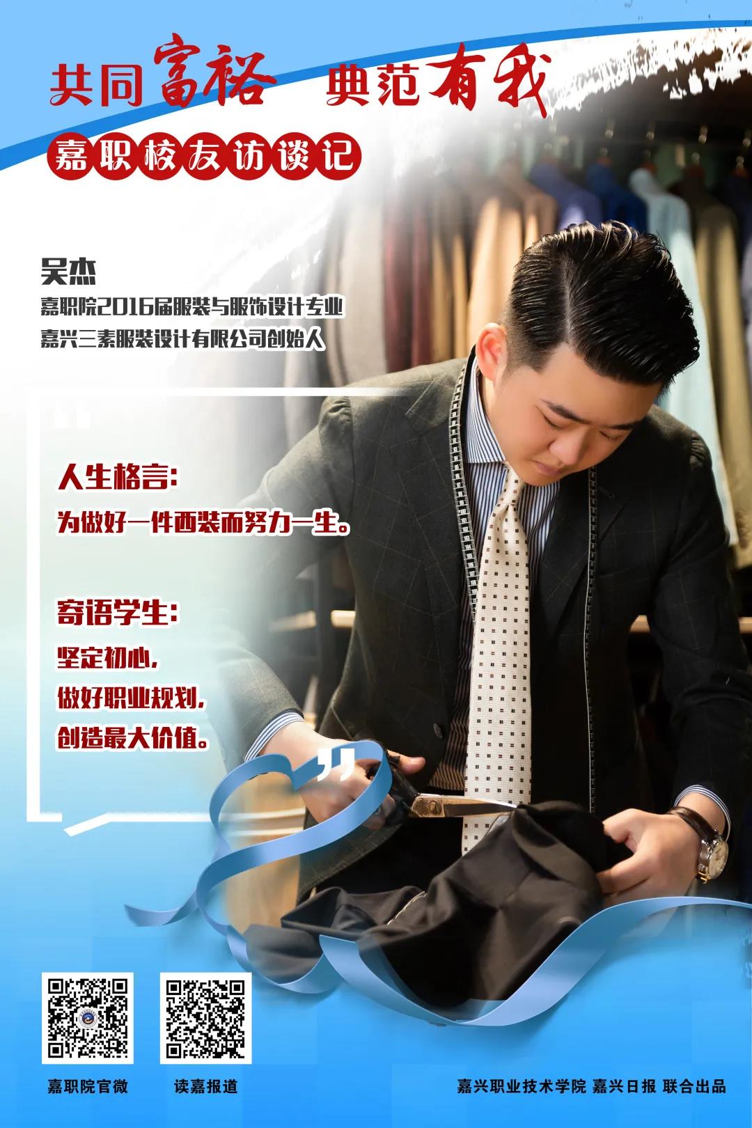 人物名片:吳杰,嘉職院2016屆服裝與服飾設(shè)計專業(yè),嘉興三素服裝設(shè)計有限公司創(chuàng)始人。