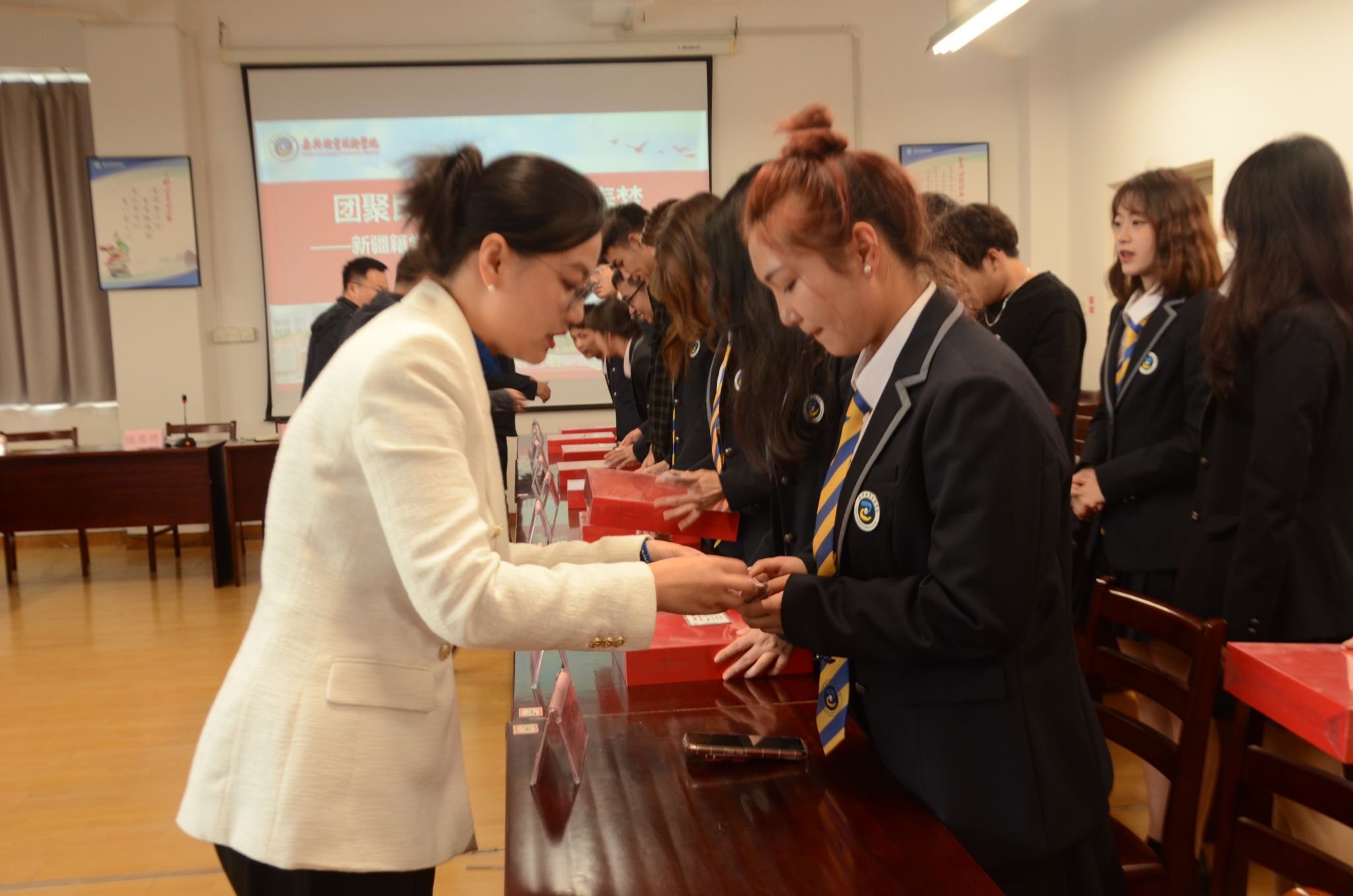 本次活動分為“暖心結(jié)對、攜手共進(jìn)”結(jié)對儀式等三個階段,在結(jié)對儀式上,學(xué)院領(lǐng)導(dǎo)、黨支部書記、專任教師、班主任、輔導(dǎo)員、學(xué)生干部們依次與新疆籍學(xué)生交換“結(jié)對聯(lián)系卡”,為新疆籍學(xué)生們送上“中國青年筑夢史”文具禮盒,希望同學(xué)們都能立志做有理想、敢擔(dān)當(dāng)、能吃苦、肯奮斗的新時代好青年。