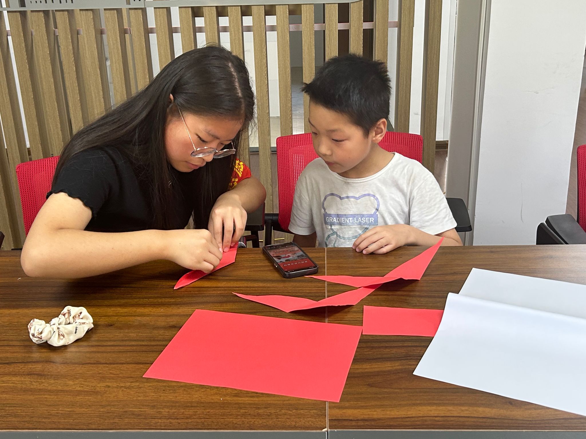 活動現(xiàn)場,學(xué)院青年志愿者帶領(lǐng)社區(qū)青少年體會中國傳統(tǒng)折紙和剪紙文化的魅力,經(jīng)過描、折、剪、展、修等一系列工藝,一幅精美的單色剪紙藝術(shù)品呈現(xiàn)在同學(xué)們面前,在志愿者和同學(xué)們的通力合作下,《紅心向黨》《團(tuán)花系列》《美在中國》《英雄兒女》等優(yōu)秀作品逐一呈現(xiàn),志愿者們?yōu)橥瑢W(xué)們講解每幅作品背后的故事和蘊(yùn)含的意義。