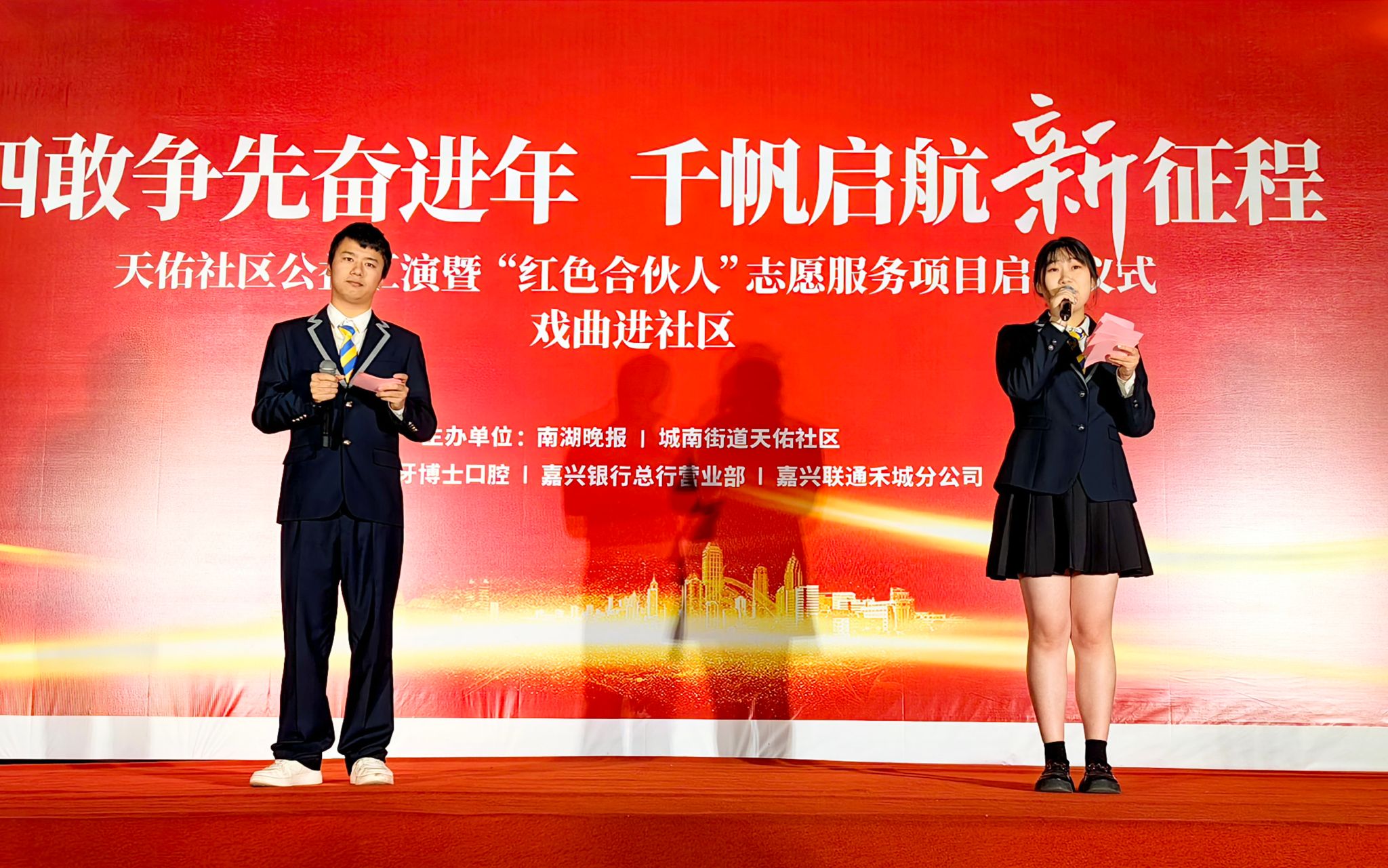 紅船青馬營大學生志愿者不僅積極參與嘉興市公共文化品牌建設,還積極參加社區(qū)文化活動。前不久,紅船青馬營4名大學生志愿者在嘉興市經(jīng)開區(qū)天佑社區(qū)黨群服務中心“四敢爭先”文藝晚會上亮相,帶來詩歌朗誦、空手道等精彩表演,贏得了社區(qū)工作人員和市民的一致稱贊。