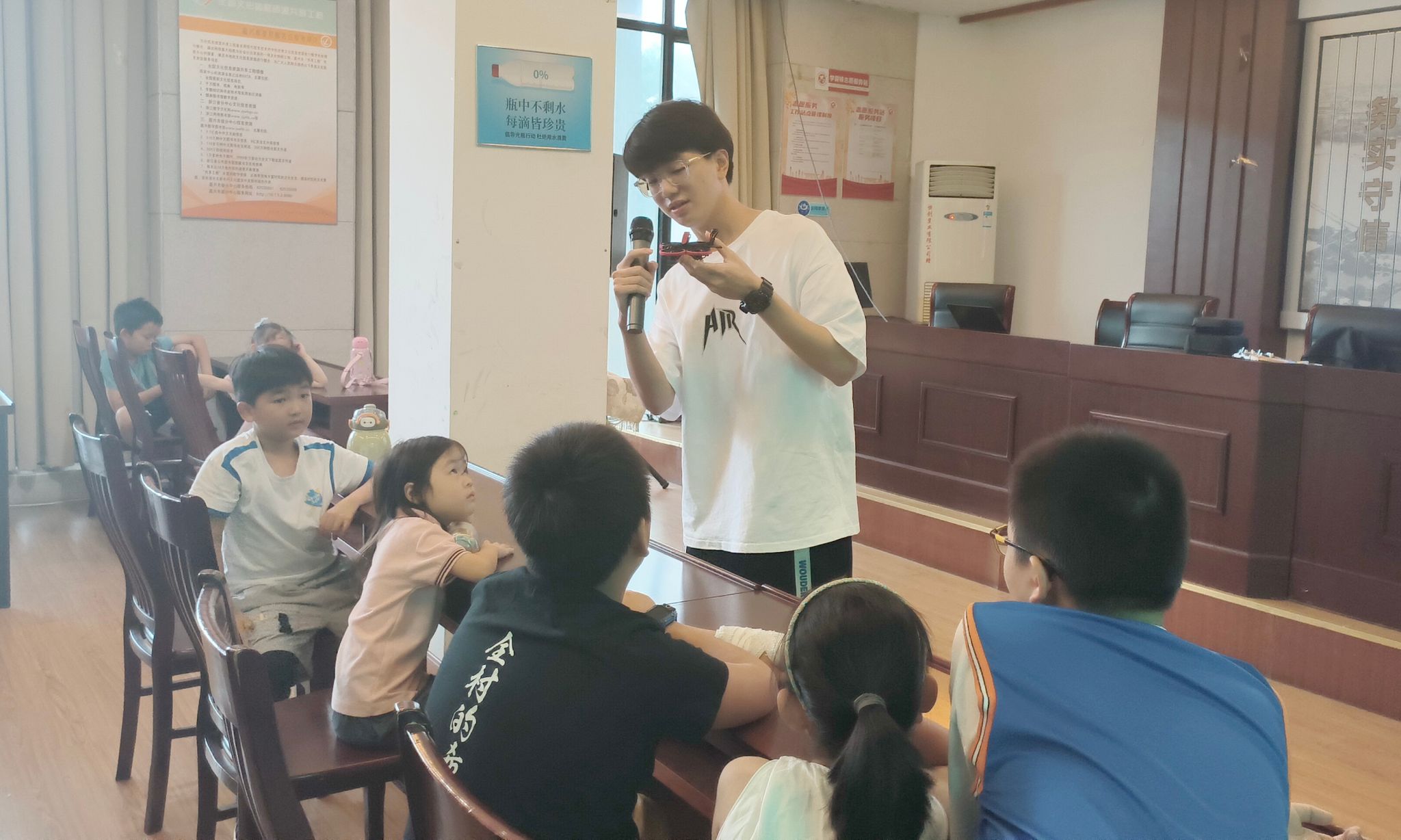 志愿者們?yōu)樾∨笥褌冊(cè)敿?xì)講解了無人機(jī)的定義、原理、構(gòu)造、分類及其發(fā)展史,播放了無人機(jī)飛行及應(yīng)用科普視頻等。他們邊講解邊拿著無人機(jī)飛行器展示給每一位小朋友,小朋友們仔細(xì)觀察,表現(xiàn)出對(duì)無人機(jī)操控技術(shù)的強(qiáng)烈興趣。