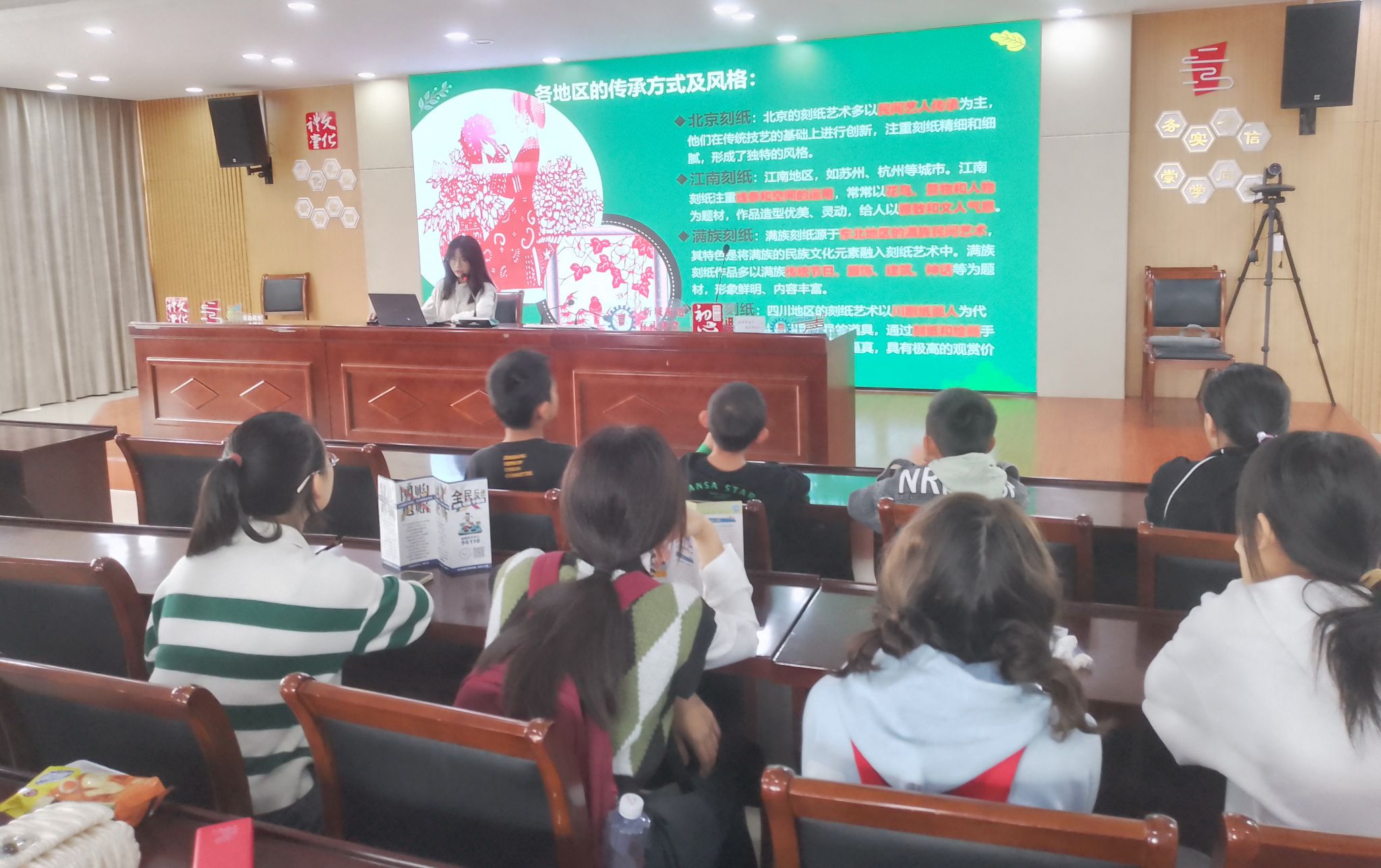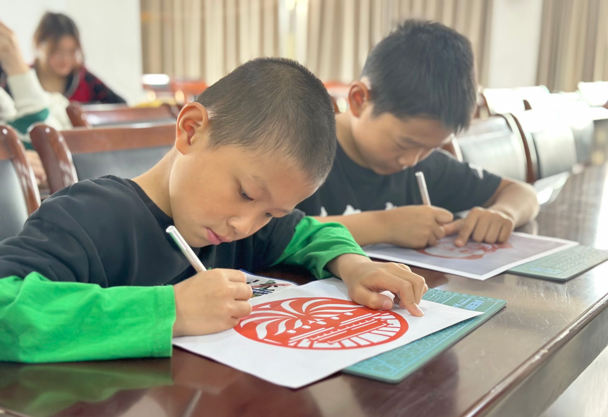 在紅色刻紙環(huán)節(jié),紅船青馬營(yíng)大學(xué)生志愿者徐夢(mèng)嵐從刻紙藝術(shù)的特點(diǎn)價(jià)值、保護(hù)措施,以及未來(lái)拓展和影響力等方面為小朋友們進(jìn)行了一系列知識(shí)講解??碳埶囆g(shù)起源于民間,可追溯至漢代。刻紙藝術(shù)大體可分為北京刻紙、江南刻紙、四川刻紙等,不同地區(qū)刻紙藝術(shù)側(cè)重各異,風(fēng)格眾多。隨后,小朋友們手握刻刀,在實(shí)踐中領(lǐng)略刻紙的魅力。一把刻刀,一張紅紙,刻刀在紅紙上飛舞,精美的圖案鏤空呈現(xiàn)。