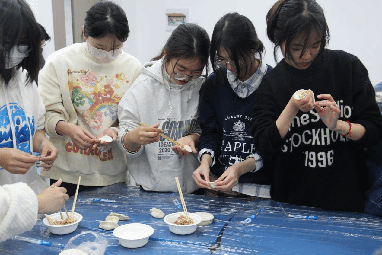 活動現(xiàn)場,師生們在桌子旁圍成一個圈,左手托著餃子皮,右手用筷子夾餡,再用手捏褶子,每個人捏出了不同風格的餃子。師生們一邊包餃子,一邊分享自己和家人過節(jié)的故事,現(xiàn)場既熱鬧又溫馨。