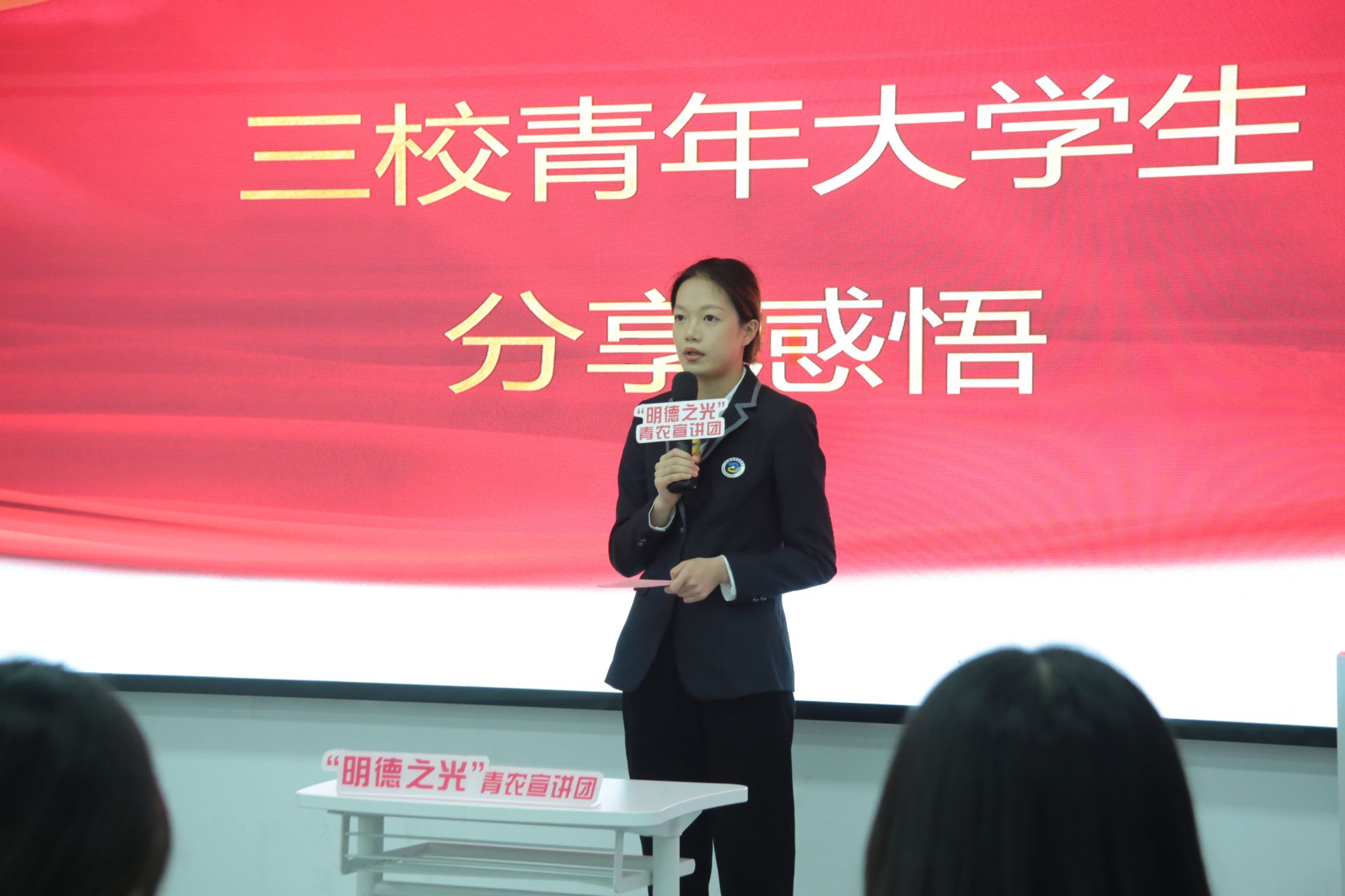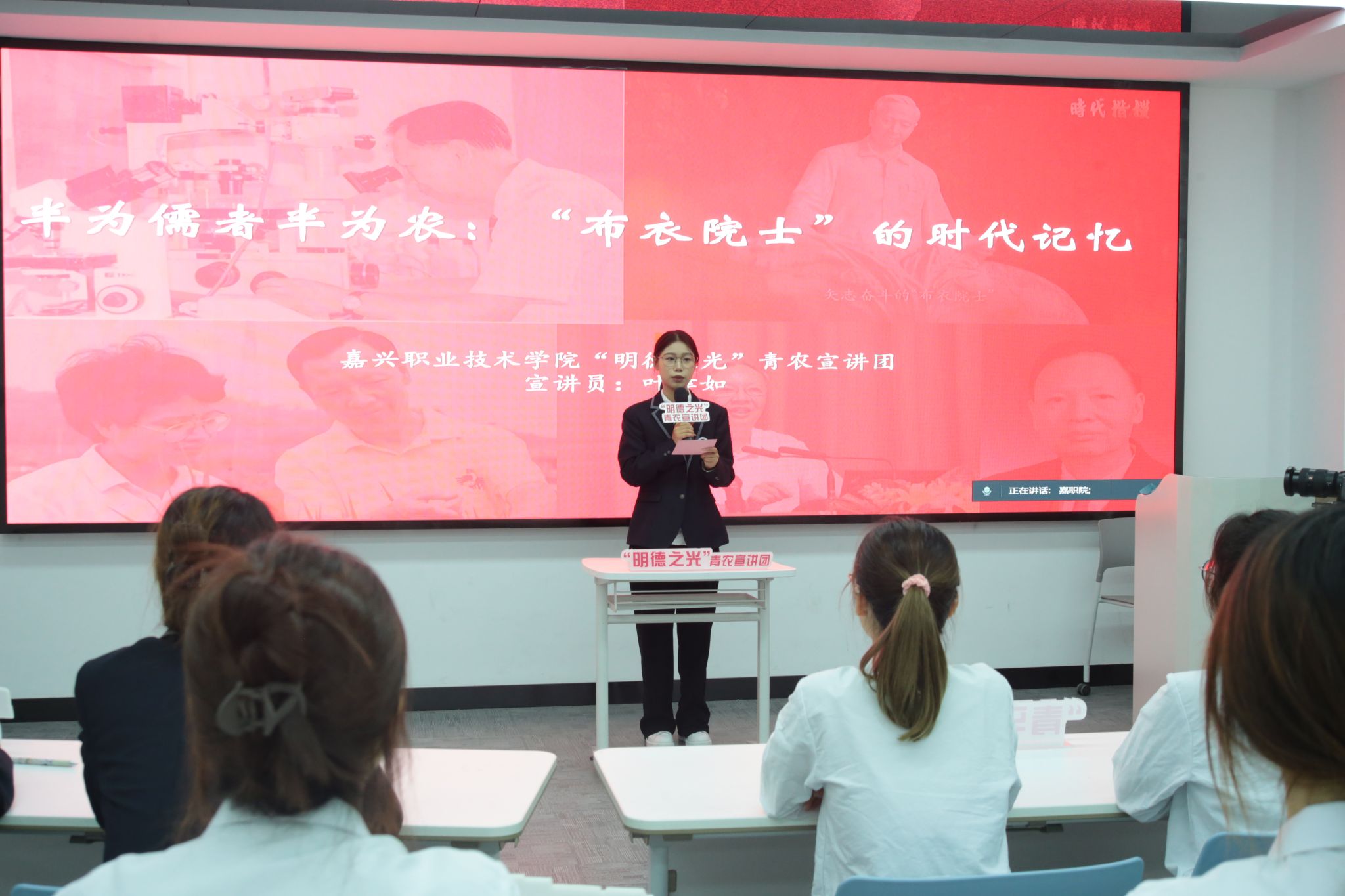 理論宣講環(huán)節(jié),嘉職院“明德之光”青農(nóng)宣講團(tuán)成員葉倖如以《半為儒者半為農(nóng):“布衣院士”的時(shí)代記憶》為題,講述了“布衣院士”盧永根堅(jiān)守理想信念、入黨救國、振興農(nóng)業(yè)、強(qiáng)國富民的一生。新時(shí)代新青年,定將以師為學(xué),以理想者、擔(dān)當(dāng)者、奮斗者的姿態(tài),傳承“盧永根精神”,為鄉(xiāng)村振興和共同富裕注入青年新動(dòng)能。湖職院宣講員施旭慧、杭職院宣講員賈詩琪分別作題為《祖國繁榮昌盛 中華璀璨耀眼》《紅醫(yī)精神:跨越時(shí)空的力量之源》的宣講。