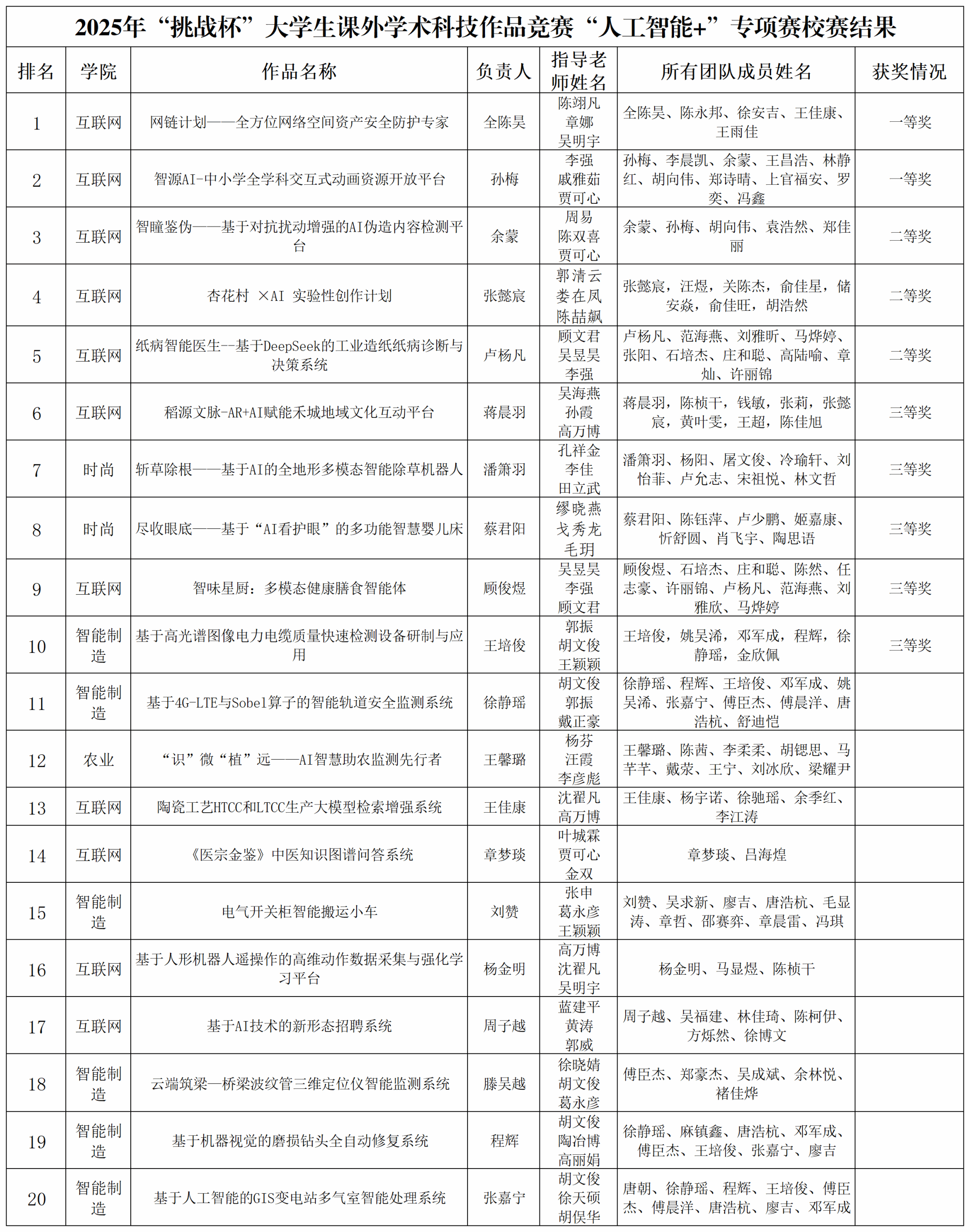 根據(jù)《關(guān)于組織開展“挑戰(zhàn)杯”大學生課外學術(shù)科技作品競賽“人工智能+”專項賽校賽的通知》,經(jīng)專家評審,共評選出一等獎2項,二等獎3項,三等獎5項,現(xiàn)予以公示。 公示期為2025年6月27日——2025年7月4日,如有疑問或異議,請及時與校團委聯(lián)系,聯(lián)系電話:0573-89978126。