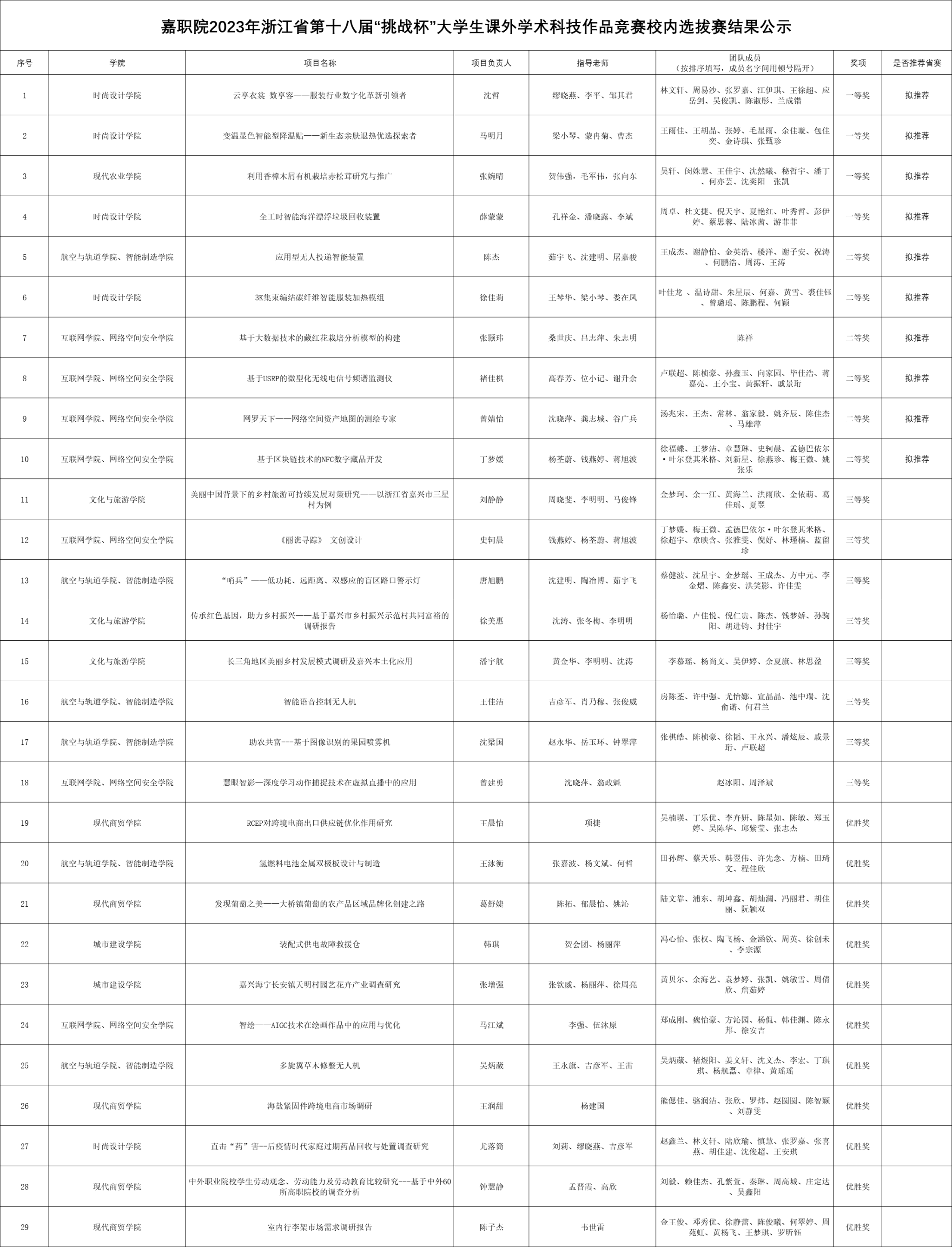 根據(jù)嘉職院團(tuán)〔2023〕6號(hào)《關(guān)于組織開展浙江省第十八屆“挑戰(zhàn)杯”大學(xué)生課外學(xué)術(shù)科技作品競賽校賽的通知》,經(jīng)校賽組織專家評(píng)審,共評(píng)選出一等獎(jiǎng)4項(xiàng),二等獎(jiǎng)6項(xiàng),三等獎(jiǎng)8項(xiàng),優(yōu)勝獎(jiǎng)11項(xiàng)。其中,校賽前十名擬推薦報(bào)送省賽,現(xiàn)予以公示。公示期為2023年3月31日——2023年4月5日,如有疑問或異議,請(qǐng)及時(shí)與校團(tuán)委聯(lián)系,聯(lián)系電話:0573-89978162。