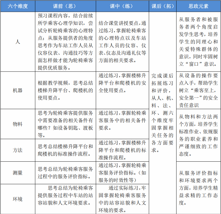 高素質(zhì)、高水平的軌道交通客運(yùn)服務(wù)人員是實(shí)現(xiàn)軌道交通行業(yè)良性發(fā)展的先決條件。《城市軌道交通客運(yùn)服務(wù)》課程的思政內(nèi)涵,就是培養(yǎng)軌道交通企業(yè)中與乘客直接接觸的高素質(zhì)一線技能型人才,以建設(shè)交通強(qiáng)國的大局意識、牢固的安全意識和扎實(shí)的專業(yè)技能保障乘客的生命財(cái)產(chǎn)安全,以得體的儀容儀表、規(guī)范的服務(wù)技能、熟練的溝通技巧為不同乘客群體提供優(yōu)質(zhì)、貼心的客運(yùn)服務(wù),以良好的應(yīng)變能力處理突發(fā)狀況,展示軌道交通企業(yè)良好的服務(wù)形象,增強(qiáng)軌道企業(yè)的競爭力,提升企業(yè)效益。本文將現(xiàn)場管理中理念引入課程思政的教學(xué)實(shí)踐中,創(chuàng)新性地提出了“六維一體”課程思政的實(shí)施模式,并結(jié)合《城市軌道交通客運(yùn)服務(wù)》課程中的典型工作任務(wù)《輪椅乘客服務(wù)》進(jìn)行詳細(xì)闡釋,構(gòu)建了課程思政實(shí)施的新路徑,從六個(gè)維度全方位、全過程、全面深入實(shí)施課程思政,可以更好地發(fā)揮課程思政的隱形育人功能。