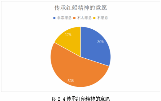 針對(duì)傳承紅船精神的意愿這個(gè)維度分析,愿意在閑暇時(shí)間去宣傳紅船精神占比30%,不太愿意,視情況而定占比53%,不愿意占比17%,如圖2-4所示。