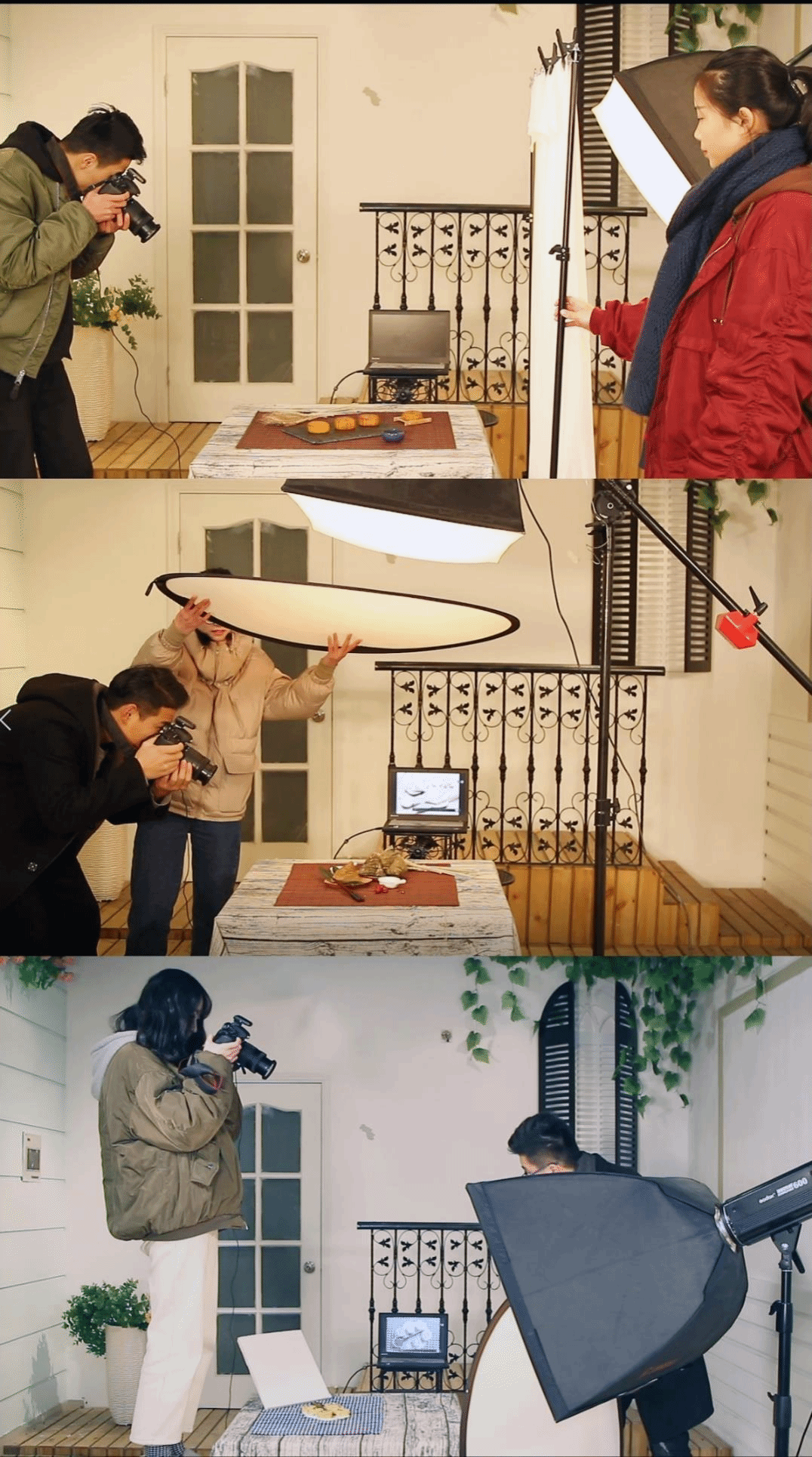 教師進行實時指導(dǎo),鼓勵多次嘗試,各組相互比較,相互學(xué)習(xí),直到構(gòu)圖滿意為止,經(jīng)過各種嘗,期望達到相得益彰的效果,更符合品牌文化理念和網(wǎng)店消費者喜好。布光是課堂實施的重點,也是難點,為了解決這個問題,我們用了 LR軟件進行聯(lián)機拍攝,實時的將布光后拍攝的效果顯示在電腦上,以便學(xué)生及時調(diào)整光位、光質(zhì)和光的強度。(如圖 4 所示)根據(jù)食品的特點,可以選擇自然光,但為了更好的控制光源,我們更多的選擇用人造光源來模擬自然光。
