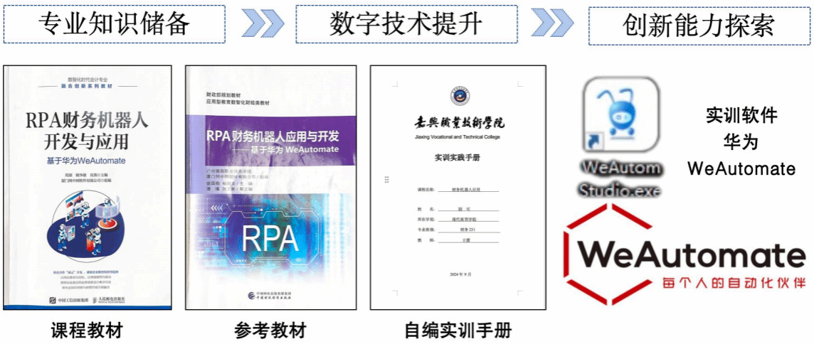 教材作為“三進(jìn)”工作的基礎(chǔ)和保證?!敦?cái)務(wù)機(jī)器人應(yīng)用》課程歷經(jīng)三年的課程實(shí)施,遵循專業(yè)數(shù)字化發(fā)展趨勢(shì),依托“專業(yè)教研室+黨支部”的集體智慧,精心選取由中國(guó)人自主研發(fā)的財(cái)務(wù)機(jī)器人軟件(WeAutomate)、配套教材《RPA 財(cái)務(wù)機(jī)器人開發(fā)與應(yīng)用:基于華為 WeAutomate》和自編課程實(shí)訓(xùn)手冊(cè)。內(nèi)容循序漸進(jìn),由淺入深。教材中任務(wù)設(shè)計(jì)由簡(jiǎn)單到復(fù)雜,緊密貼合學(xué)生的認(rèn)知發(fā)展規(guī)律,充分展現(xiàn)了財(cái)務(wù)專業(yè)在數(shù)字技能領(lǐng)域的變革與發(fā)展趨勢(shì),凸顯新時(shí)代背景下技術(shù)與管理的深度融合。教材中任務(wù)設(shè)計(jì)依據(jù)國(guó)家“十四五”規(guī)劃和 2035 年遠(yuǎn)景目標(biāo)綱要中關(guān)于提升企業(yè)技術(shù)創(chuàng)新能力、激發(fā)人才創(chuàng)新活力的創(chuàng)新驅(qū)動(dòng)發(fā)展戰(zhàn)略,培養(yǎng)學(xué)生樹立強(qiáng)國(guó)意識(shí)和創(chuàng)新精神;強(qiáng)調(diào)習(xí)近平新時(shí)代中國(guó)特色社會(huì)主義思想對(duì)創(chuàng)新驅(qū)動(dòng)發(fā)展的引領(lǐng)作用。案例資源豐富,還原場(chǎng)景?!敦?cái)務(wù)機(jī)器人應(yīng)用》充分挖掘每章教學(xué)內(nèi)容蘊(yùn)含的思政元素,從愛國(guó)精神、家國(guó)情懷、職業(yè)操守、社會(huì)責(zé)任感等多維度探索思政案例。教材中,任務(wù)場(chǎng)景引用依法納稅等規(guī)范操作案例,融入相關(guān)法律法規(guī),引導(dǎo)學(xué)生增強(qiáng)法律意識(shí),具備良好的職業(yè)操守和社會(huì)責(zé)任感。同時(shí),明確全面推進(jìn)依法治國(guó)和全面深化改革的重要性。在自編實(shí)訓(xùn)手冊(cè)中“流程梳理-小組實(shí)施-個(gè)人展示-任務(wù)評(píng)價(jià)”的案例解析形式,展現(xiàn)財(cái)務(wù)機(jī)器人在業(yè)財(cái)稅一體化業(yè)務(wù)流程的實(shí)際應(yīng)用,有效培養(yǎng)學(xué)生的自信心、團(tuán)隊(duì)協(xié)作能力,以及職業(yè)道德和家國(guó)情懷等理想信念教育。