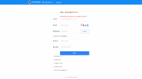初次登录时候要求输入学生本人到校使用的手机号,初始密码默认身份证后六位,登录后系统要求同学修改密码强度。点击发送验证码后,获取短信验证码。