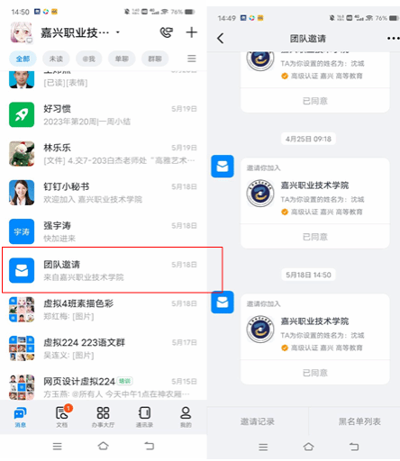 为自己的手机下载钉钉应用并申请本人钉钉号码,申请方法(附件 1),当申请和绑定都完成后,在开学前 1~2 周内将收到团队邀请的钉钉通知,选择同意进入嘉兴职业技术学院组织,即可以进入嘉职院组织及对应专业。(图 5)已绑定了嘉职院组织的号码,如果要更换手机号须参照更换步骤进行(附件 2),不建议新生更换绑定手机。