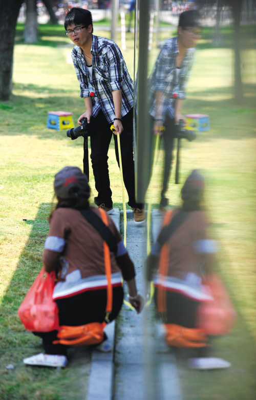 昨天上午,在市區(qū)范蠡湖公園里,嘉興職業(yè)技術(shù)學(xué)院園林設(shè)計(jì)專(zhuān)業(yè)2011級(jí)學(xué)生把課堂搬到這里,10名學(xué)生對(duì)公園實(shí)地測(cè)量,在作業(yè)中設(shè)計(jì)自己心中的“范蠡湖”。