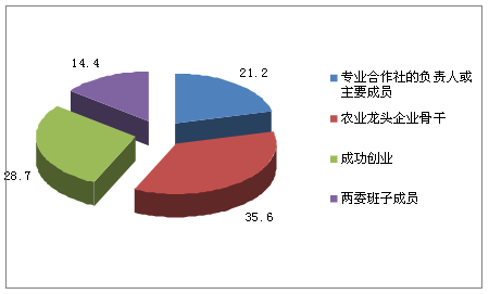 畢業(yè)的146名學(xué)員中主要從事專業(yè)合作社的負(fù)責(zé)人、農(nóng)業(yè)龍頭企業(yè)的骨干、創(chuàng)辦企業(yè)、新農(nóng)村建設(shè)帶頭人;有31人成為了專業(yè)合作社的負(fù)責(zé)人或主要成員,占21.2%;如李海根學(xué)員是平湖市大得農(nóng)生豬專業(yè)合作社理事長(zhǎng),至今合作社已有50多戶養(yǎng)殖專業(yè)戶加入,2011年,合作社出欄銷售生豬50000余頭,實(shí)現(xiàn)銷售額近億元,被評(píng)為浙江省示范性合作社。有52人成為農(nóng)業(yè)龍頭企業(yè)骨干,占35.6%;如徐美根學(xué)員是浙江青蓮食品有限公司副總經(jīng)理、運(yùn)營(yíng)中心總監(jiān),2011年完成主營(yíng)業(yè)務(wù)收入超過20億元,被評(píng)為公司“優(yōu)秀干部”和2007—2011縣“勞動(dòng)模范”。有42人成功創(chuàng)業(yè),占28.7%;如蘇明法學(xué)員創(chuàng)辦嘉興市綠農(nóng)農(nóng)產(chǎn)品有限公司,陸續(xù)建設(shè)兩個(gè)瓜蔬種植示范基地,聯(lián)結(jié)農(nóng)戶基地2200畝,帶動(dòng)農(nóng)戶1850戶,直接帶動(dòng)農(nóng)民增收5000多萬元。有21人進(jìn)入兩委班子成員,占14.4%,他們?cè)谵r(nóng)村一線帶領(lǐng)農(nóng)民創(chuàng)業(yè)創(chuàng)新。(如圖1)
