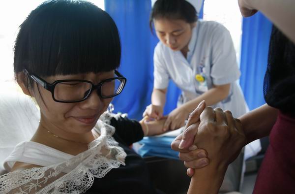 昨天下午,獻(xiàn)血車駛進(jìn)嘉興職業(yè)技術(shù)學(xué)院,同學(xué)們踴躍獻(xiàn)血。第一次參加獻(xiàn)血的女生錢憶雯顯得比較緊張,她緊緊拉著同學(xué)的手,皺著ü頭不敢直視針頭,通過護(hù)士的鼓勵,她才慢慢放松。