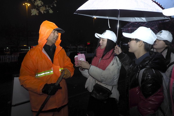 12月24日晚,由嘉興市勤禾志愿服務(wù)指導(dǎo)中心和嘉職院團(tuán)委組織的14名大學(xué)生志愿者,來到嘉興火車站附近,為環(huán)衛(wèi)工人送“平安果”,感恩在雨中工作的環(huán)衛(wèi)工人。