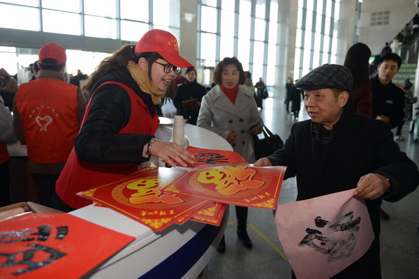 (本報通訊員 趙遠(yuǎn)遠(yuǎn) 王振宇 攝)1月26日上午,由嘉興團(tuán)市委、上海鐵·局嘉興車務(wù)段、嘉興職業(yè)技術(shù)學(xué)院“勤禾”志愿服務(wù)總隊共同組織發(fā)起的2016嘉興市志愿者服務(wù)春運(yùn)“暖冬行動”啟動。據(jù)悉,春運(yùn)期間,嘉興市將有近500名志愿者在火車站、汽車站等主要站點(diǎn),為旅客提供旅行咨詢、愛心幫困等志愿服務(wù)。圖為嘉職院志愿者為旅客送“?!薄?nbsp;