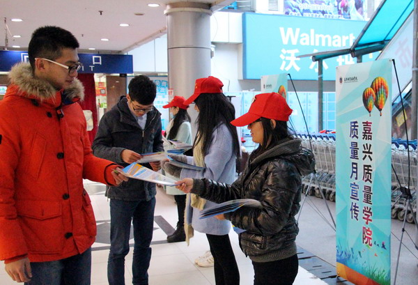 (本報通訊員 趙遠遠 李朝敏 攝)為配合推進“嘉興市全民質量素養(yǎng)提升工程三年行動計劃”,3月15日上午,嘉興職業(yè)技術學院工商與旅游分院、嘉興質量學院組織大學生志愿者走上街頭,面向市民開展質量月宣傳、咨詢活動,以提升全民質量素養(yǎng)水平。圖為志愿者在向市民發(fā)放宣傳資料。