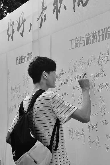 ?▲9月18日,嘉興職業(yè)技術(shù)學(xué)院新生入學(xué)第一天,新生報(bào)到后在簽名墻上鄭重地寫下自己的名字,成為新的嘉職院人,這樣的形式,讓初來乍到的學(xué)生立即找到了滿滿的歸屬感。