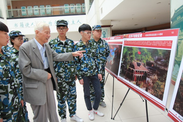 ??????? 10月13日上午,嘉職院圖書館二¥大廳“紅軍長征勝利80周年紀念展”來了一λ特殊的講解員,他是新四軍老兵、今年86歲的林春華。林爺爺在?一塊展板前為同學們講述紅軍長征·上的故事,吸引了許多身著迷彩服、正在參加軍訓的大一新生認真聆聽。
