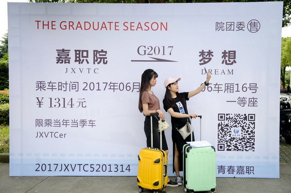 又是一年畢業(yè)季。6月15日,嘉職院校園里,兩名廣告設(shè)計專業(yè)的畢業(yè)生在“夢想列車”的“車票”前自拍留念,她們已經(jīng)找到了工作。據(jù)了解,今年嘉職院有3046名畢業(yè)生告別校園,踏上“夢想列車”。